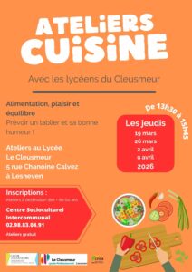 En partenariat avec le lycée Le Cleusmeur, le Centre Socioculturel vous propose de passer un moment convivial avec les lycéens lors de 4 ateliers cuisine directement dans l’enceinte de l’établissement.
